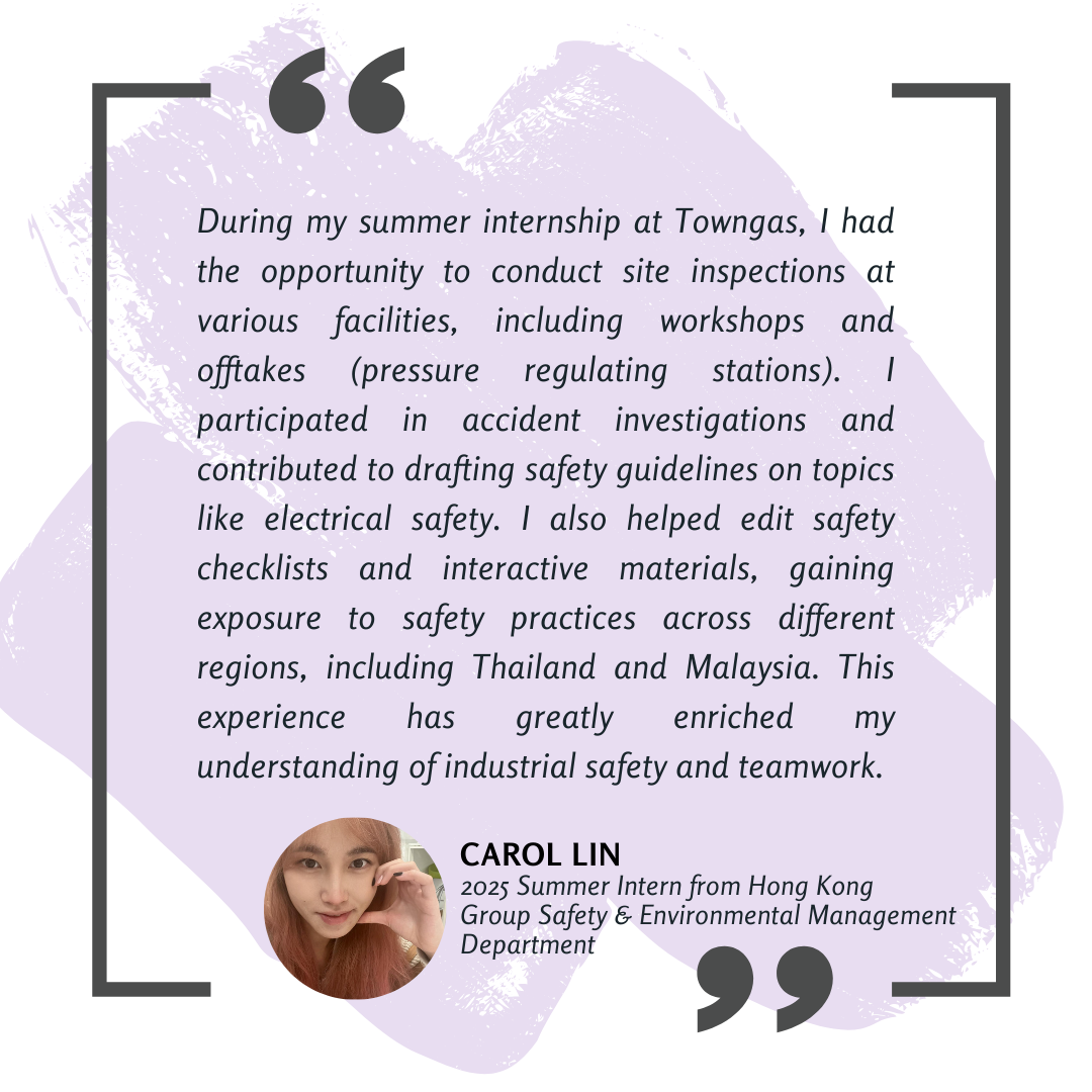 We are now inviting students to join our eight-week summer internship programme from June to August 2026. Along with comprehensive on-the-job training and diverse learning experiences, our interns will also gain invaluable insights into Hong Kong’s gas industry through group project assignments on topics related to Towngas’ business.