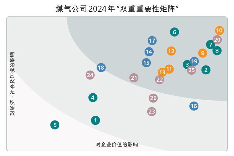 「双重重要性矩阵」根据议题对企业价值的影响(X轴),以及对经济、社会及环境的影响(Y轴),展示了26项重要性议题的相对排序。其中,共有19项议题被评定为最具重要性的核心议题。