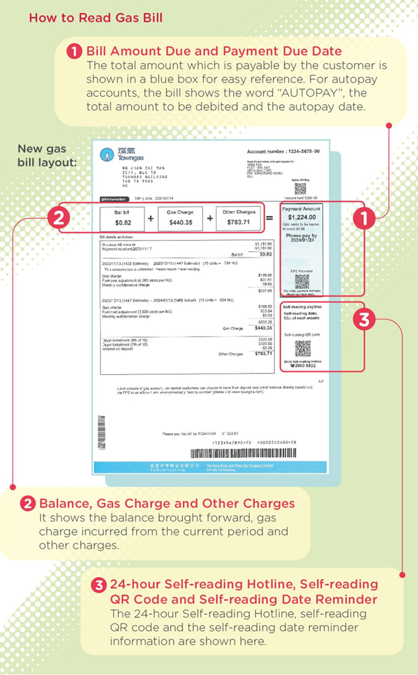 煤氣賬單已採用全新設計,客戶可更清晰查閱煤氣費和繳費資料。您亦可登記電子賬單,支持環保,