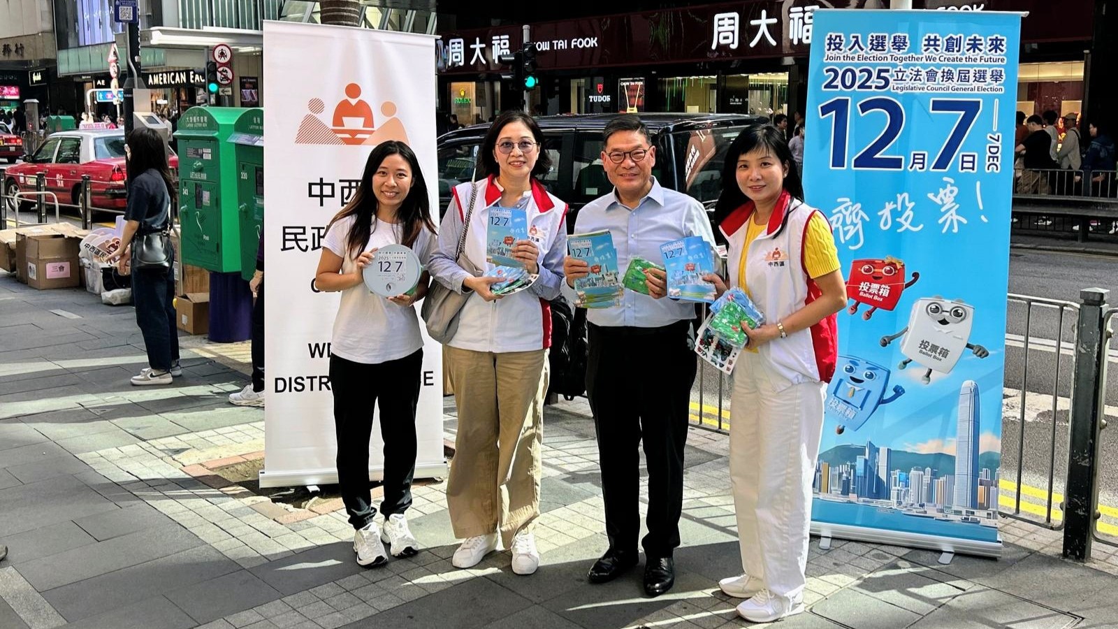 身兼中西區防火委員會委員的煤氣公司總經理—業務革新及諮詢陳華娟(右一)在中環參與宣傳,呼籲市民在立法會選舉齊投票。