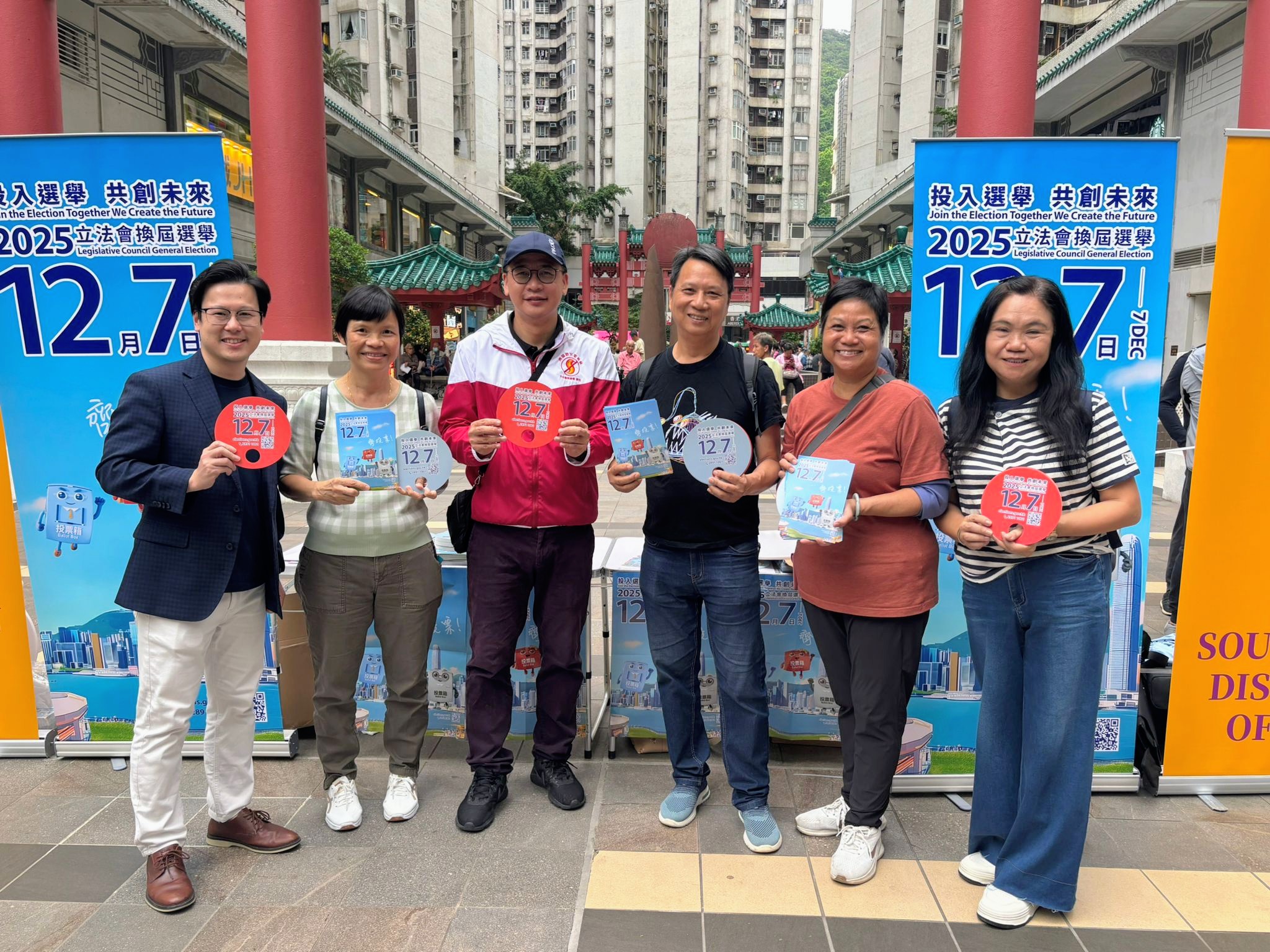 煤氣公司總經理—工商市務及營業、南區防火委員會委員江紹權(左三)向市民派發宣傳單張,鼓勵選民履行公民責任。