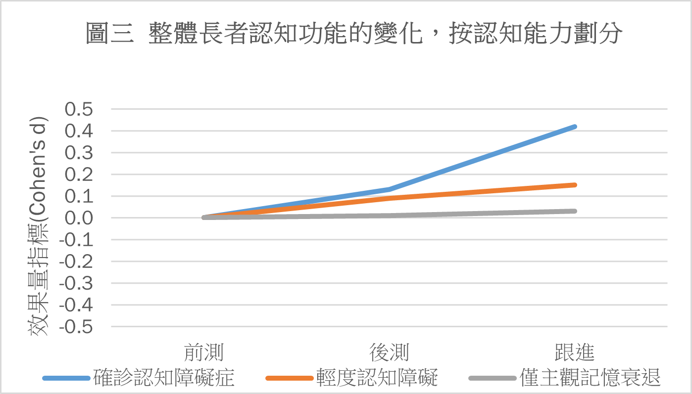 • 改善長者認知功能:長者的認知功能方面,介入組有60%長者有出現改善,而對照組則有37%。綜合所有參與長者的表現,其認知功能在課程完成後及跟進評估時均持續提升,並於跟進評估階段達統計顯著水平。確診認知障礙症的長者,其認知功能在跟進評估時的改善尤為明顯。(圖二及三)