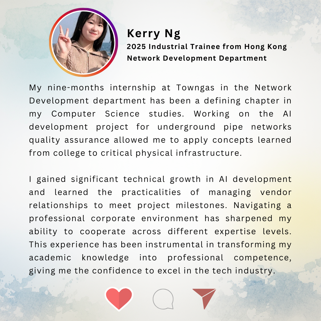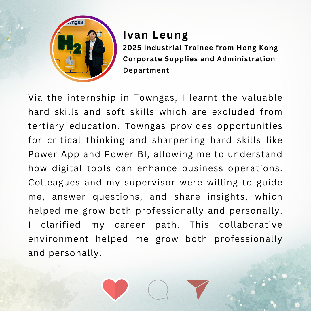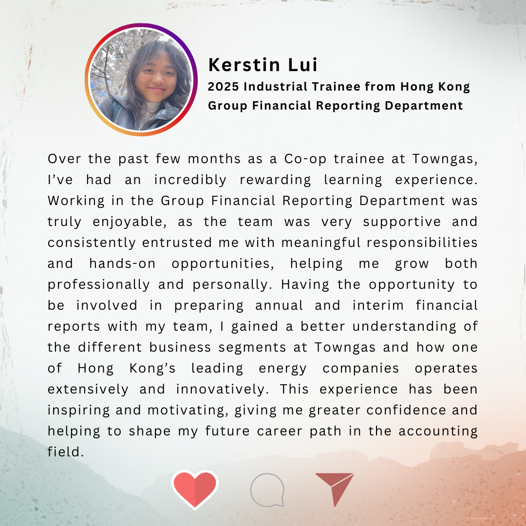 煤氣公司一直與本地大專院校合作推行半年 / 一年制企校合作實習計劃,讓學生能於畢業前累積與主修科相關的工作經驗,有效地規劃未來的職業發展方向。參與實習計劃的學生除了可於實習的過程中應用課堂上學到的知識和技能外,亦可深入了解日常工作要處理的事項,以及應對工作上的挑戰, 為未來投身社會做好準備。